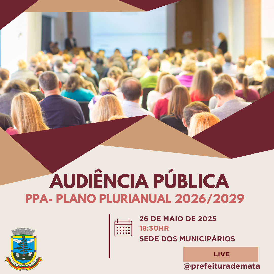 A Prefeitura de Mata convida toda a comunidade para participar da Audiência Pública do Plano Plurianual (PPA) 2026-2029.