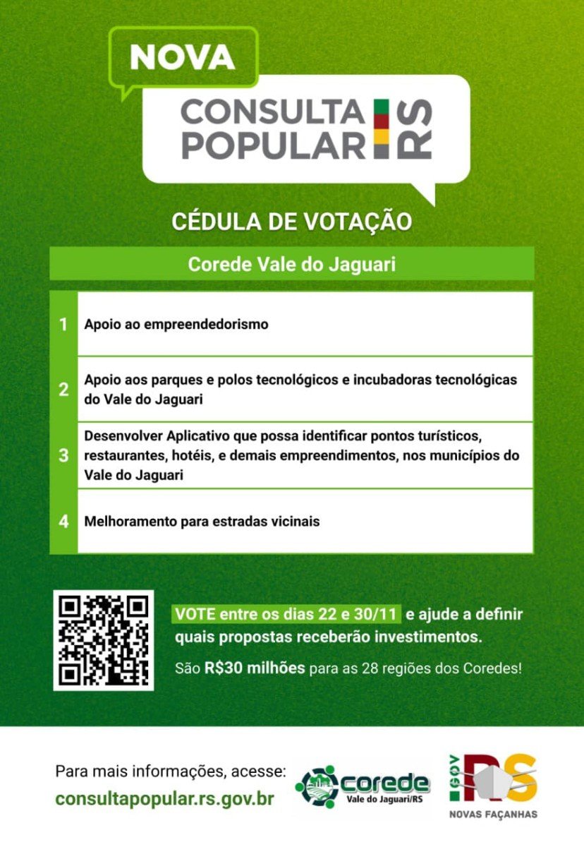 A Consulta Popular 2021, promovida pela Secretaria de Planejamento, Governança e Gestão do Rio Grande do Sul e pelos 28 Conselhos Regionais de Desenvolvimento (Coredes) do Estado, já está aberta para votação, que se estenderá até o dia 30 deste mês.