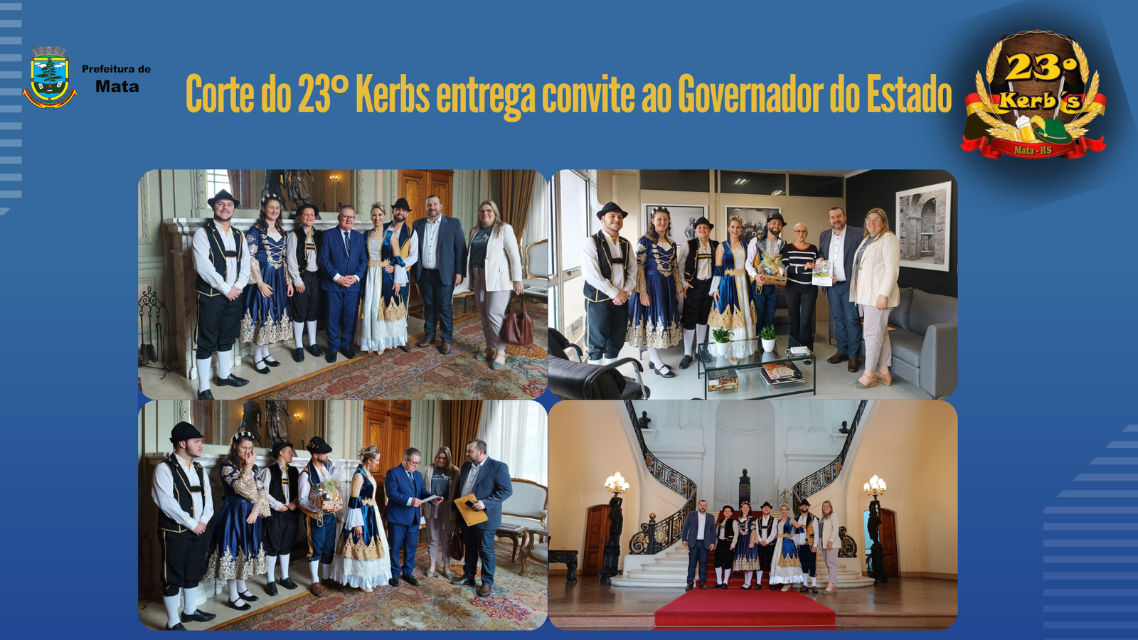 No dia de ontem (18/10) o Prefeito Rogério Kuhn, juntamente com Secretárias Adjuntas de Cultura, Turismo e Paleontologia, Silvia Taschetto e Pamela Pierini, acompanhados pela Corte do 23º Kerb’s Matense, realizaram visita ao Palácio do Piratini para entregar convite oficial ao Governador do Estado do Rio Grande do Sul, Ranolfo Vieira Júnior, acerca das festividades típicas alemãs que irão acontecer de 7 a 20 de novembro em nosso município.