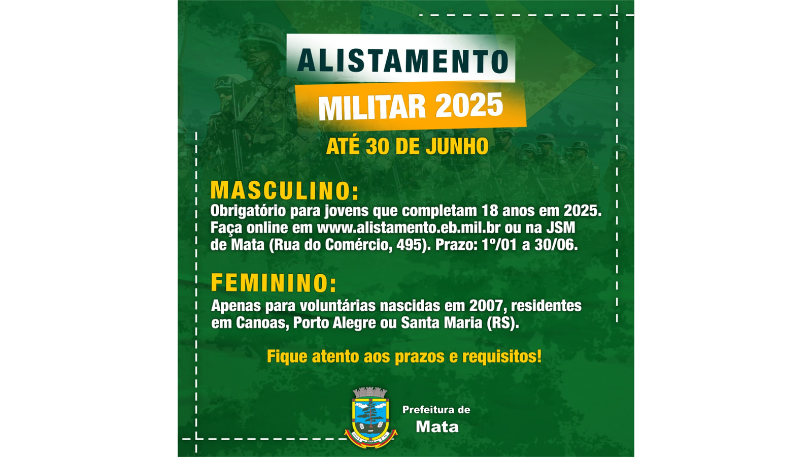Pode ser feito digitalmente no site www.alistamento.eb.mil.br ou presencialmente na Junta do Serviço Militar (JSM) de Mata.