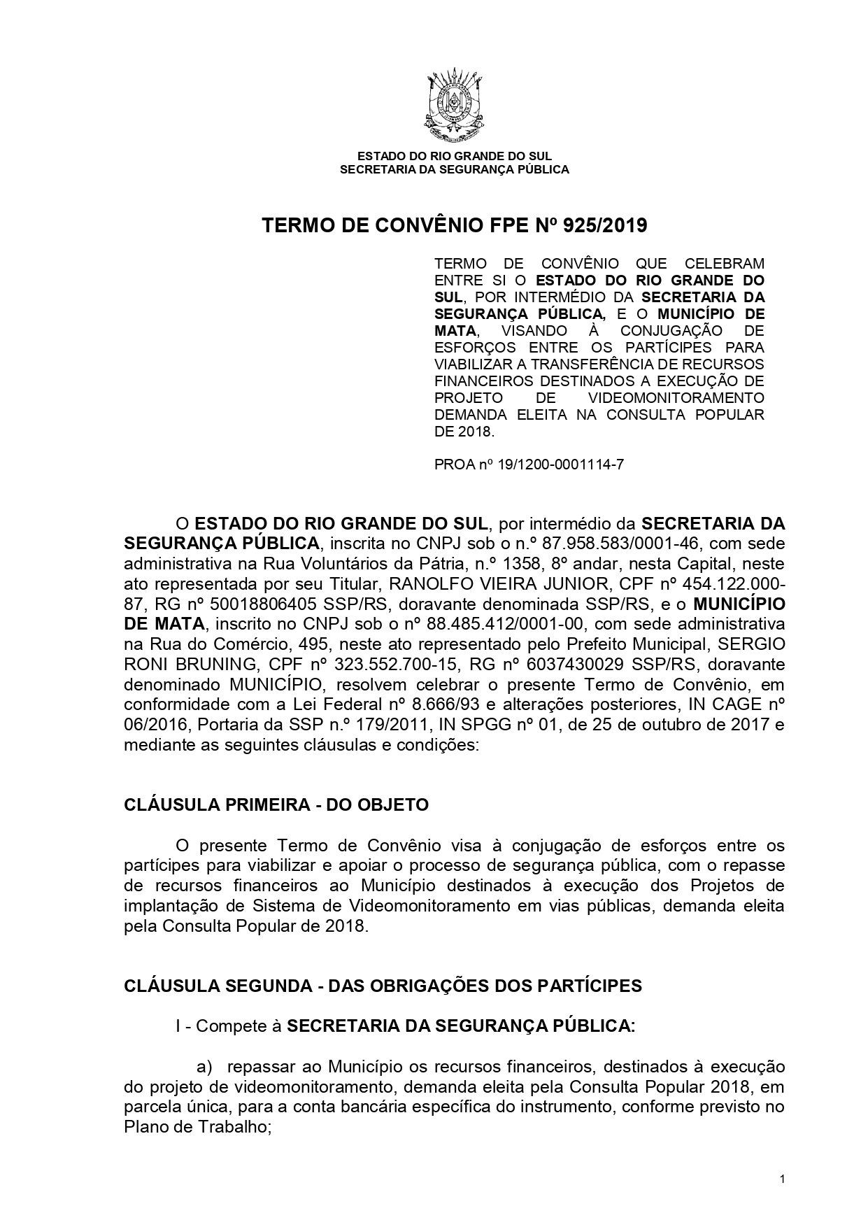 No dia 2 de janeiro (quinta-feira), o Prefeito Municipal de Mata, Sergio Roni Bruning assinou o Termo de Convênio FPE N° 925/2019 que celebram entre si o Estado do Rio Grande do Sul, por intermédio da Secretaria da Segurança Pública, e o Município de Mata, visando à conjugação de esforços entre os partícipes para viabilizar a transferência de recusrsos financeiros destinados a execução de Projeto de Videomonitoramento, demanda eleita na consulta popular de 2018.