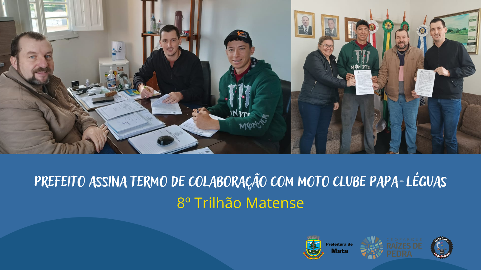 Na manhã de hoje (12/08), o Prefeito Rogério Kuhn, juntamente com a Secretária Adjunta de Cultura, Turismo e Paleontologia, Silvia Taschetto, receberam representantes do grupo Moto Clube Papa-Léguas, Eduardo Lesina Mascarin e Douglas Bruning, para assinatura de Termo de Colaboração, que prevê o repasse de recursos no valor de R$ 5.000,00 (cinco mil reais) para apoio na realização do 8º Trilhão Matense, que se realizará nos dias 27 e 28 de agosto.