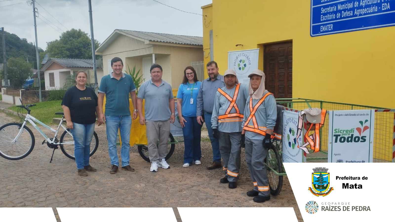 Na oportunidade foram entregues dois kits contendo:Bicicleta, carrinho e EPI’s completos, para o Presidente da Associação de Catadores de Mata, Emerson Martins acompanhado de sua esposa.