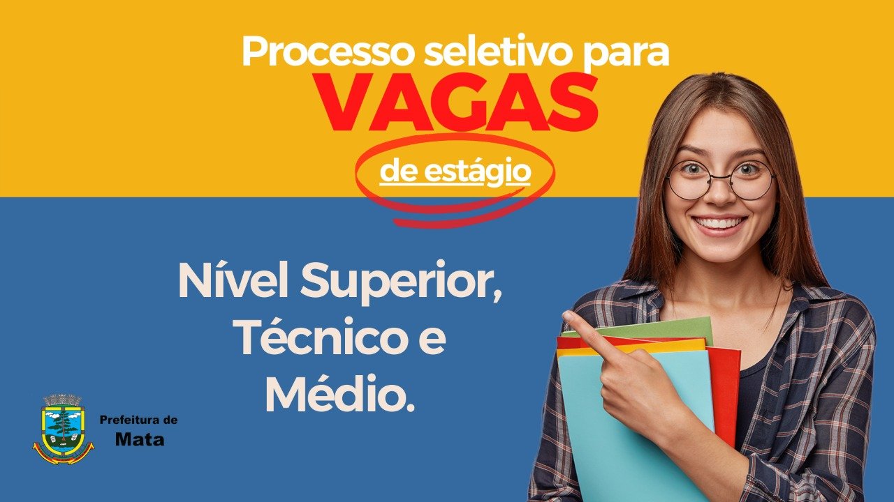 A Prefeitura de Mata torna pública a abertura de processo seletivo de seleção de estagiários (cadastro reserva) de nível superior, técnico e médio, com pagamento de Bolsa Auxílio.