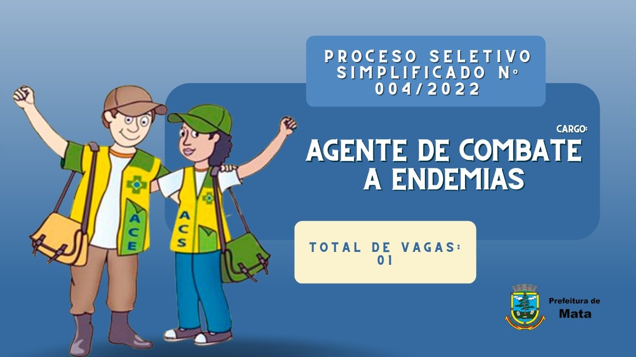 A Prefeitura de Mata torna pública a abertura de Processo Seletivo Simplificado – PSS para contratação por prazo determinado de 01 (um) AGENTE DE COMBATE A ENDEMIAS.