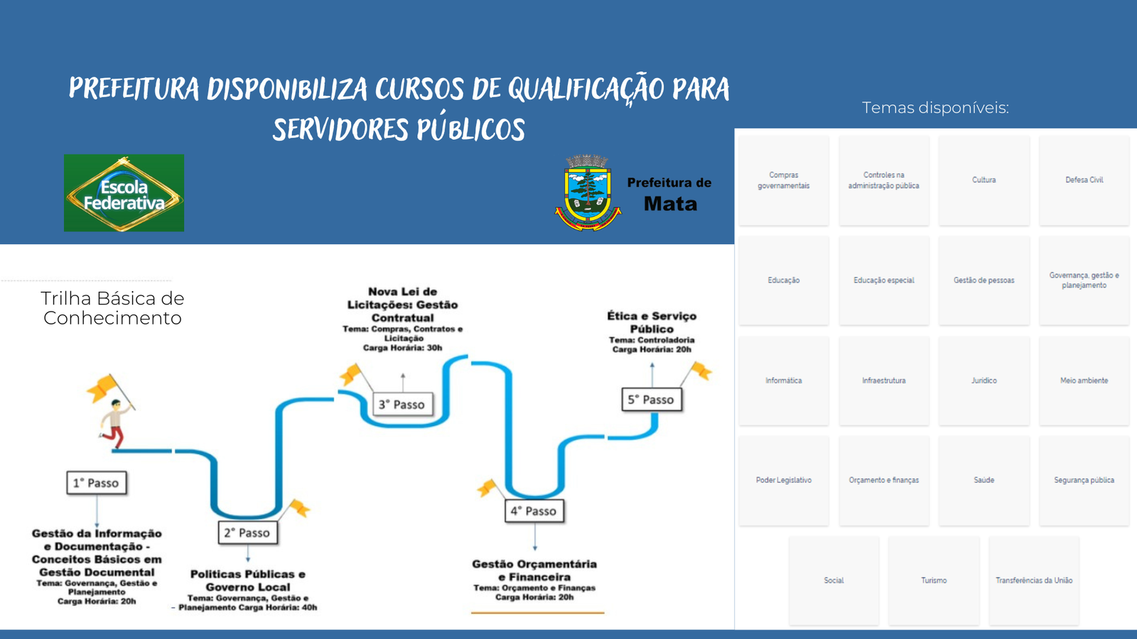 Com o objetivo de qualificar os servidores públicos municipais a Prefeitura de Mata está oferecendo gratuitamente cursos de curta duração, na modalidade educação à distância, em diversas áreas de conhecimento.