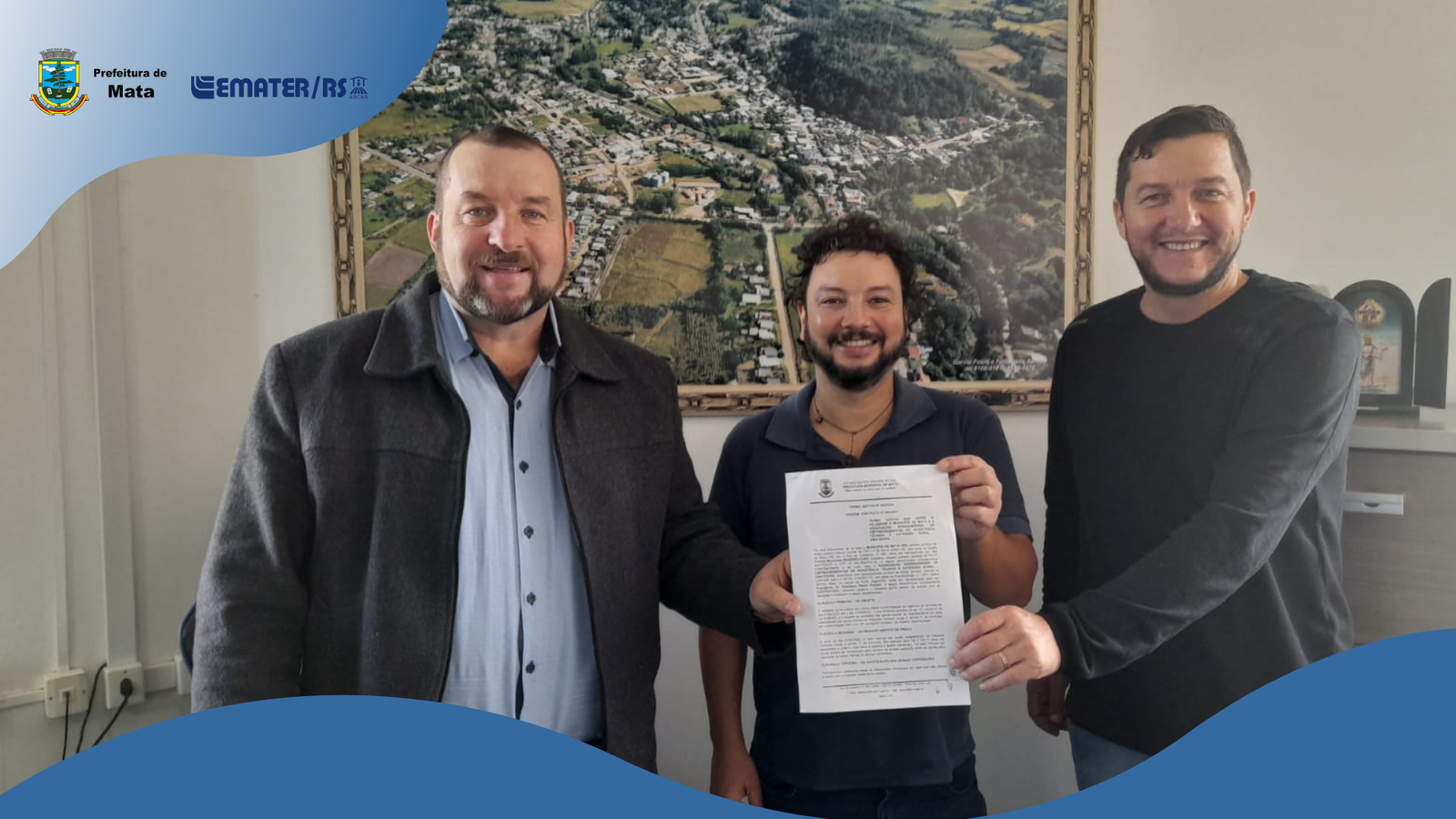 Na manhã de ontem (25/05), o Prefeito Rogério Kuhn, juntamente com o Vice-Prefeito, Mauricio Taschetto, receberam o Chefe do Escritório da Emater-RS/Ascar em Mata, Sr. Bernardo Jornada, para assinatura do novo contrato de prestação de serviços entre a empresa de extensão rural e o município.