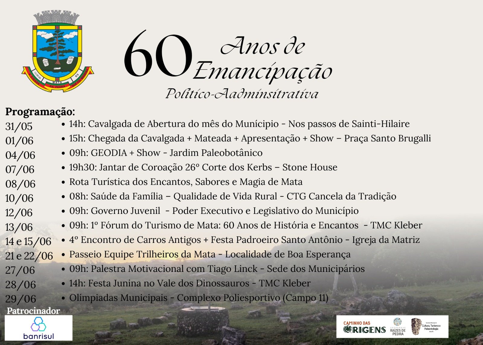 A Prefeitura Municipal convida a população e toda a região para conferir a programação especial de aniversário de emancipação político-administrativa do nosso município. Tem cultura, turismo, saúde, educação e muita celebração! 🥳