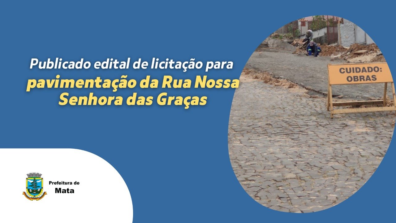 A Prefeitura de Mata publicou ontem (18/10) certame licitatório para realização de obras de pavimentação da Rua Nossa Senhora das Graças. O edital de licitação na modalidade de Tomada de Preços encontra-se disponível no site do município para acesso dos interessados.
